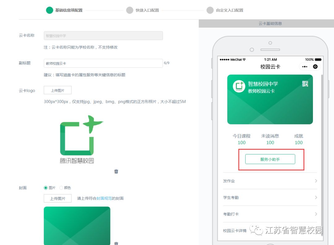 系统提供了教师、家长、学生卡片的基础管理功能,颜色、标题、封面、卡片基本信息项;支持自定义快捷功能入口,可以选择智慧校园已有功能,也可以自主添加新的功能