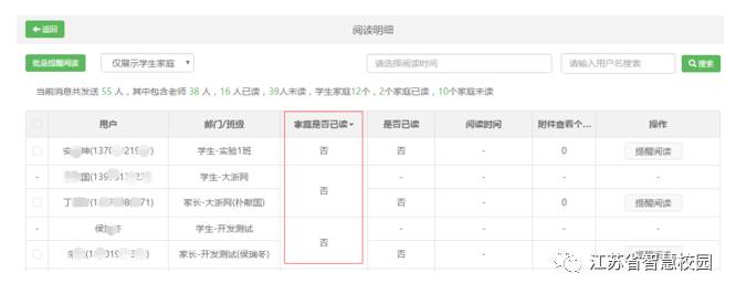 为了便于学校管理人员和老师查看每个家庭的消息阅读情况,针对没有阅读的家庭及时给出通知提醒或电话提醒,以免学生遗漏重要通知,智慧校园提供了按家庭纬度查看消息已读未读情况