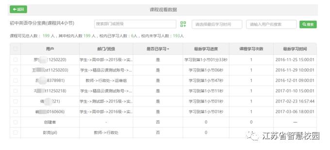 为了便于学校管理者和老师了解课程的学习效果,并针对未学习的用户给出及时的提醒,智慧校园提供了校内课程学习情况的简要统计,学校管理员和老师可以查看哪些用户已学习课程,学习了几次,学习到第几章节等信息